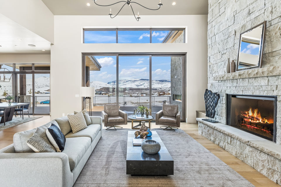 This mountain contemporary home is perched majestically in Victory Ranch, Utah. A high-end luxury community on a world class golf course offering year round amenities. This architectural marvel seamlessly blends modern design with the natural beauty of its surroundings. The home features sleek lines and expansive windows, inviting the outdoors in and framing the breathtaking vistas of the cliffs beyond. As you step inside, you are greeted by an open-concept living space adorned with warm wood accents and contemporary finishes.